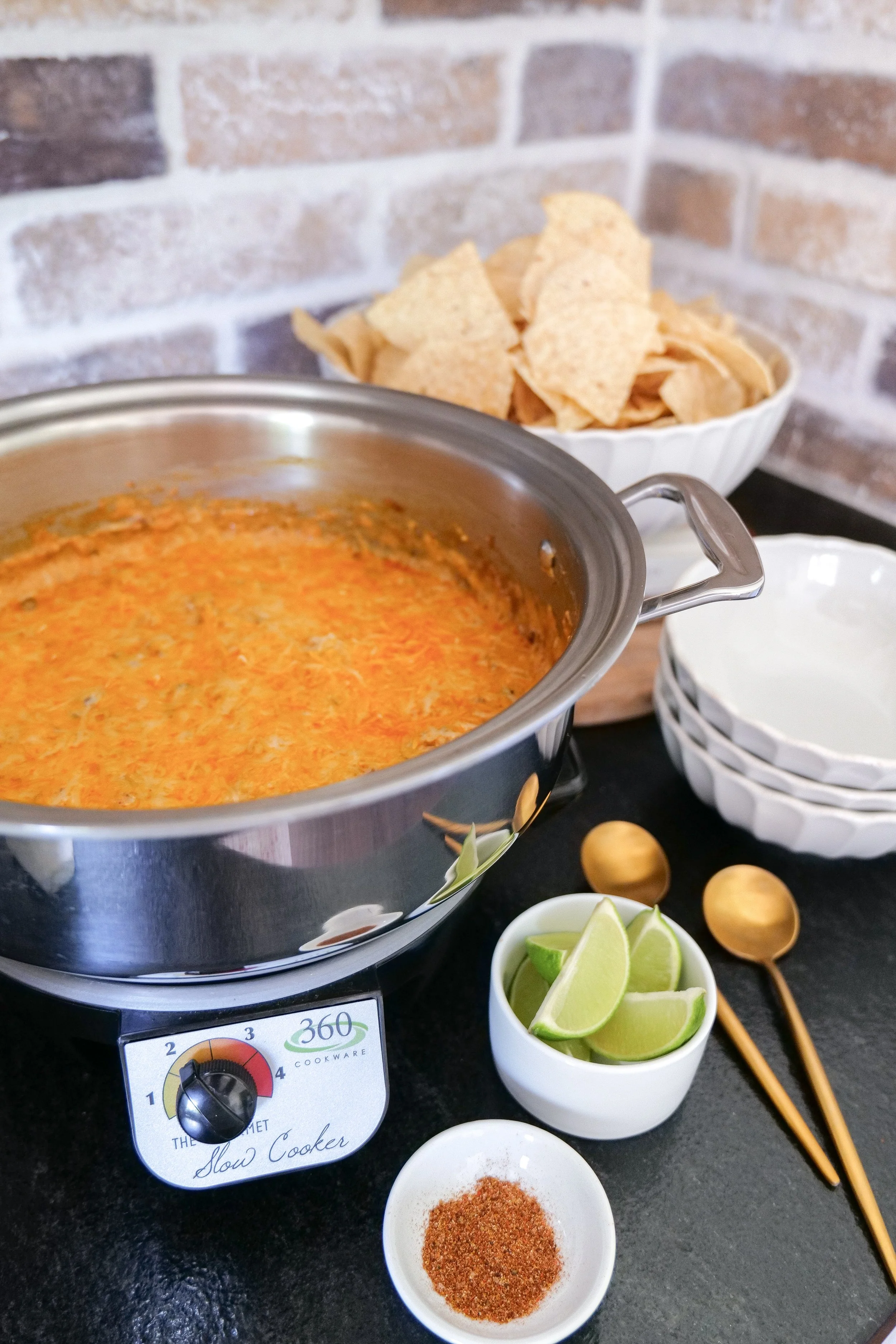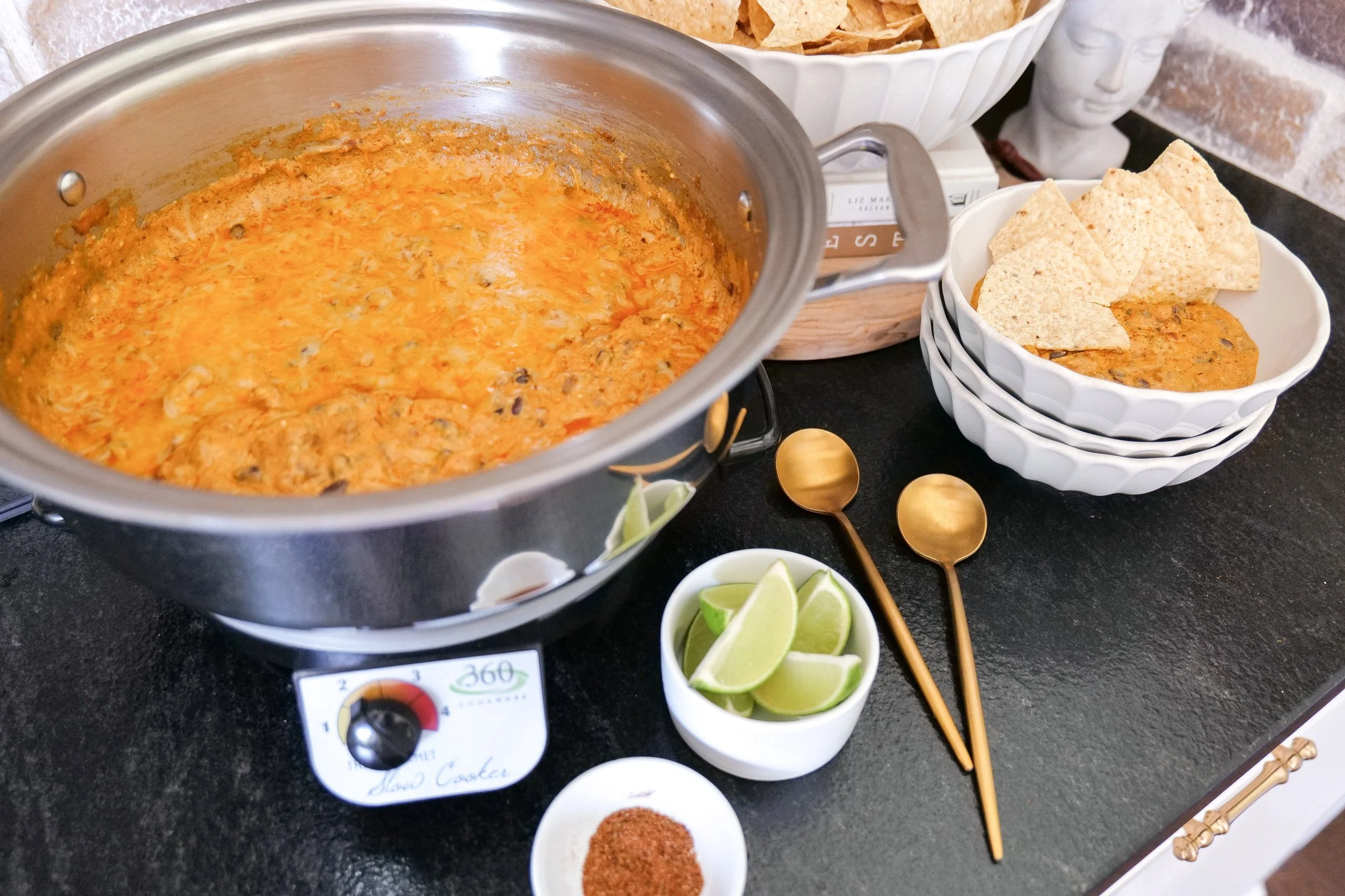 To create this mouthwatering dip, start by preparing your slow cooker. I use the 360 slow cooker for all my slow cooker recipes for many reasons but I love that its non-toxic as well as has a removable pot to brown your meat on the stove before you slow cook. To begin you will place chicken breasts at the bottom of the slow cooker, ensuring they're evenly spaced. Layer on a delicious mixture of enchilada sauce, cream cheese, and a generous amount of shredded cheese for that irresistible creamy texture and flavor. Now, it's time to build on those flavors. Add in chopped onions, green chiles, and a mix of spices like cumin and chili powder to infuse your dish with those traditional enchilada aromatics. Set your slow cooker to low heat and let the magic happen. You'll want to cook this combination for several hours until the chicken is tender and easily shredded. Once the chicken is ready, simply mix everything to create a uniform, dip-like consistency that's both delectable and inviting. Before serving don't forget the garnishes. Adding fresh cilantro, additional cheese or green onions right before serving is a visually appealing treat. This not only adds a vibrant freshness but also a pop of color against the warm, cheesy dip. Serve with a side of tortilla chips, fresh vegetables, or use it as a filling for tacos or burritos. No matter how you serve it you're in for a treat!
