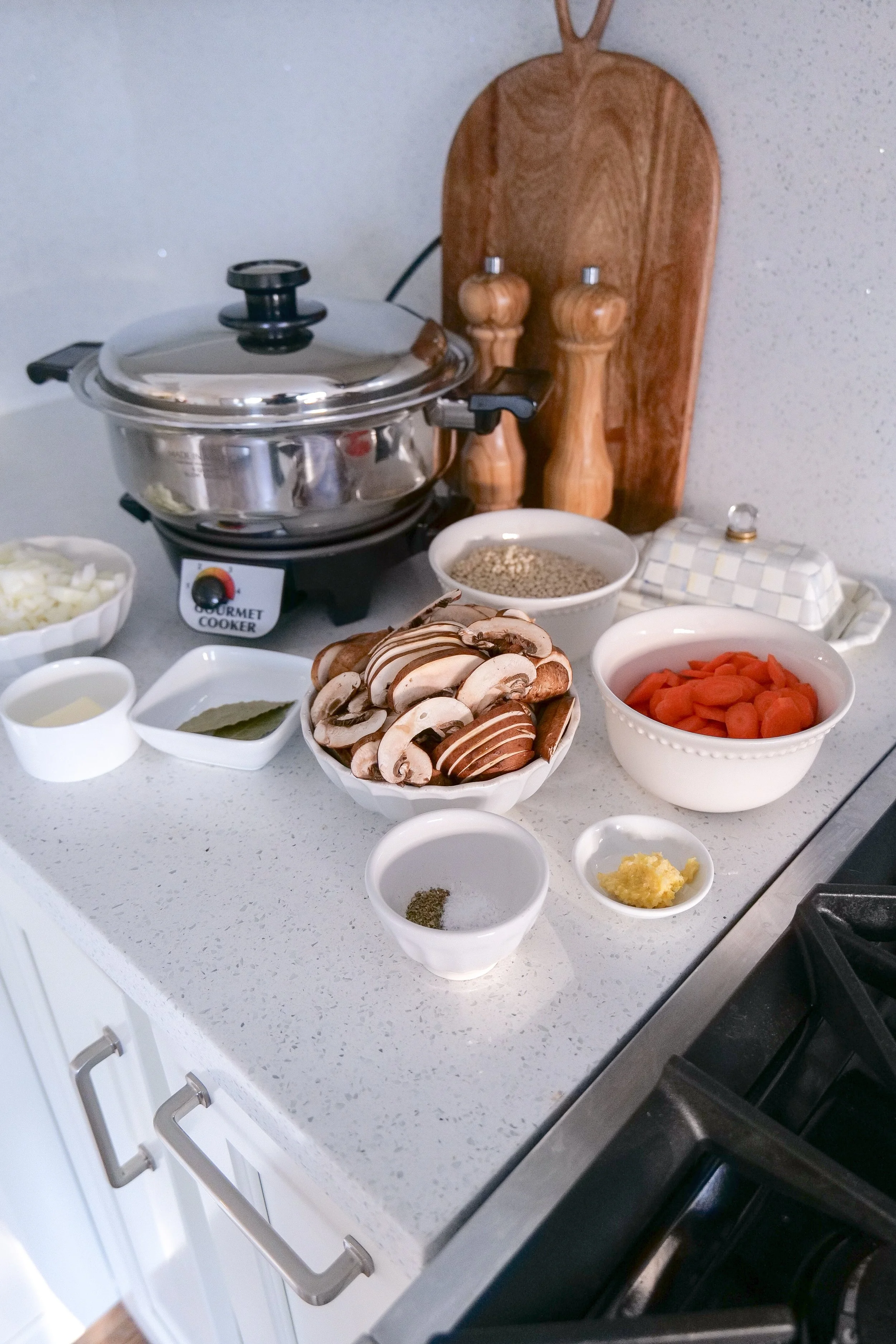 1. Melt butter in large pan (if using a slow cooker like mine you can remove from base and use on stove). Add in finely chopped onion and garlic, cooking until onion is transparent. Add in mushrooms, carrots and seasoning. Stir until all vegetables are coated.