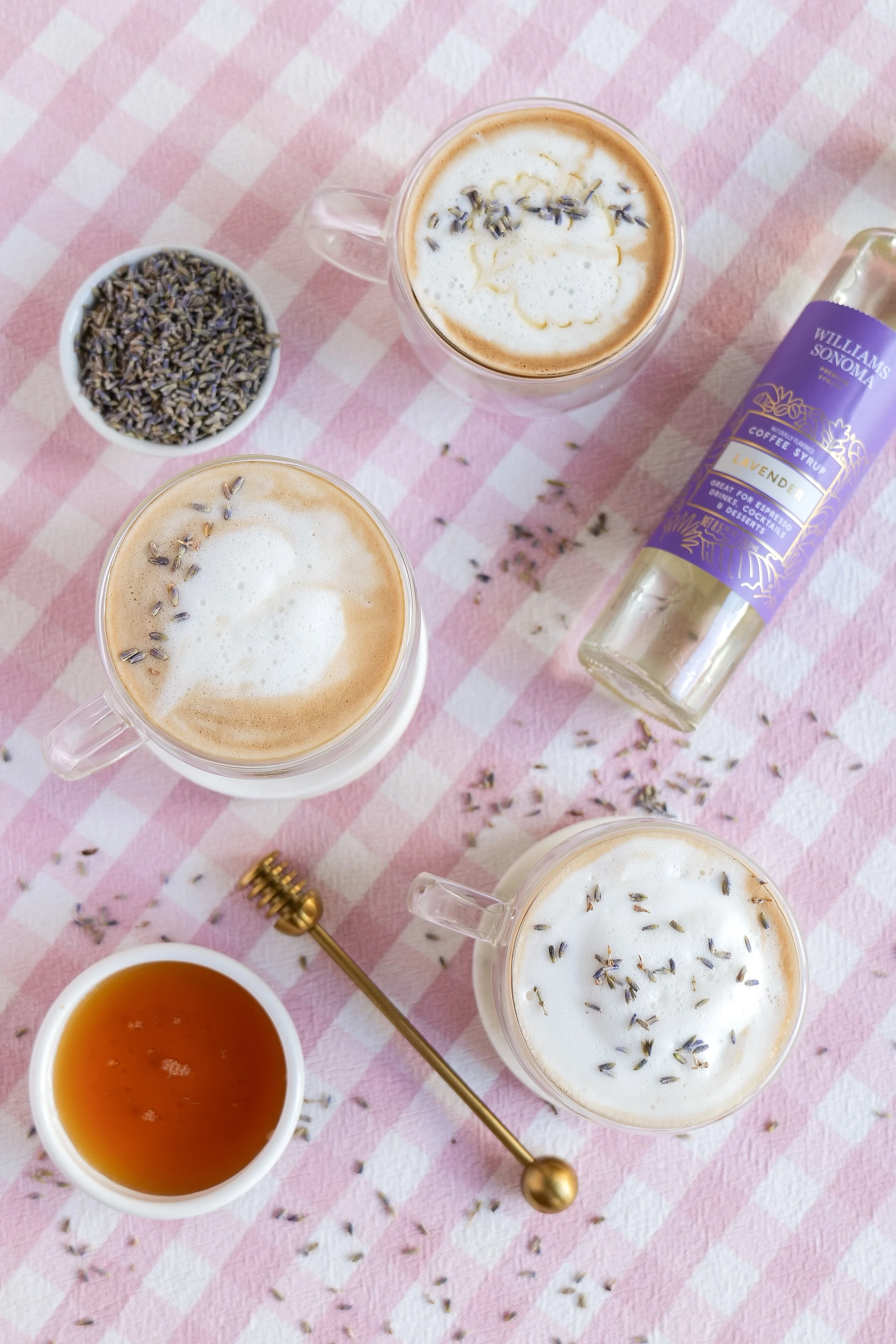 Making this lavender latte involves the nice blend of several ingredients and steps, each contributing to the delightful final product. Begin by preparing a lavender simple syrup which you can make this on your own. This involves simmering together water, sugar, and dried lavender flowers until both the sugar dissolves and the lavender's aroma fills the mixture. Or you can take the simple route like I did and purchase the perfected one from Williams Sonoma. Next, brew a strong shot of espresso or your preferred coffee base to ensure the latte remains robust. The next step is to steam and froth your selected milk, whether dairy or plant-based, to achieve a creamy, silky texture essential to an outstanding latte. Finally, blend the espresso and steamed milk in a mug, sweetening the mixture with the lavender syrup and honey to taste. For added sweetness and visual appeal, drizzle honey over the top and garnish with dried lavender or a sprinkle of cinnamon.