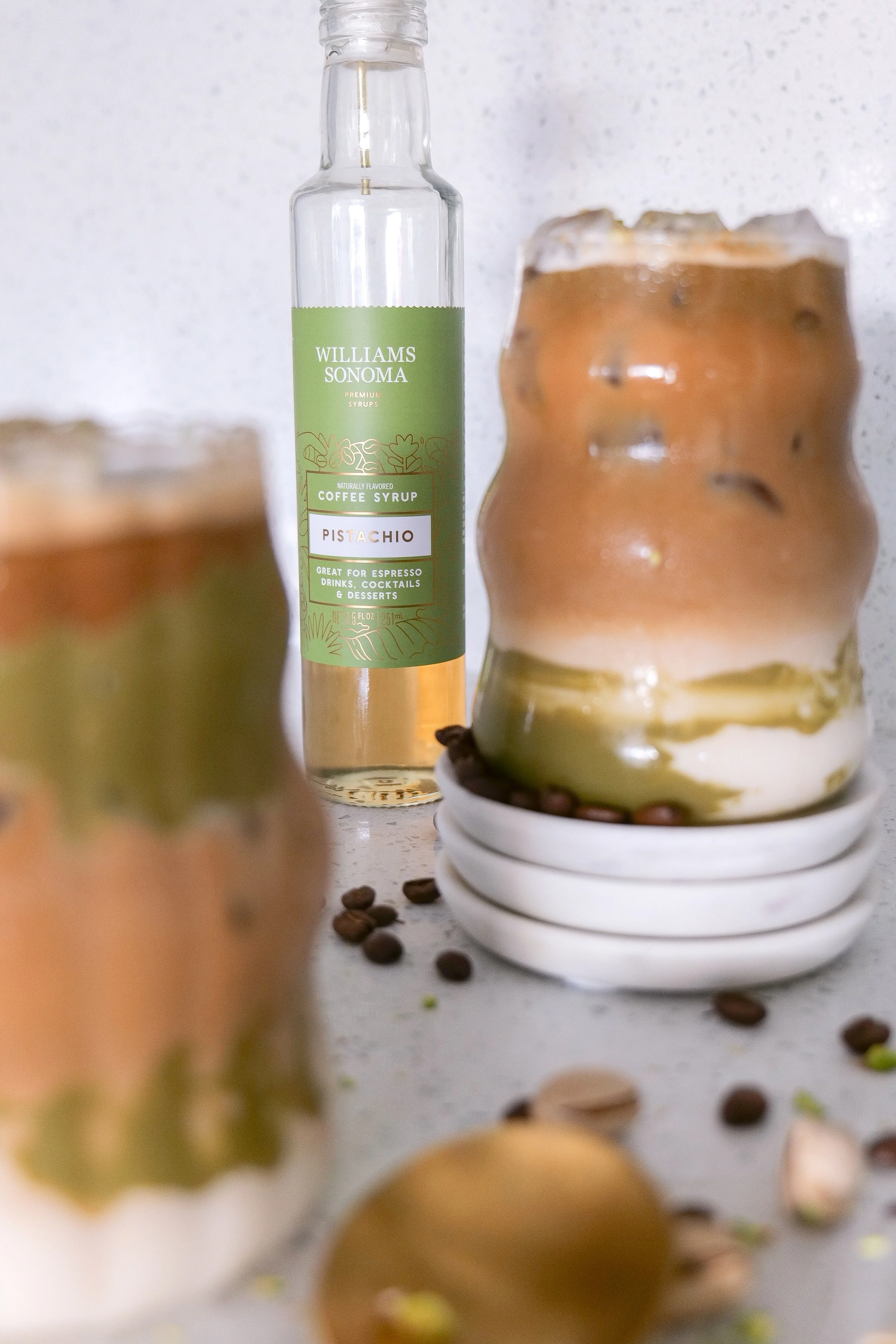 Pistachio syrup's versatility extends beyond just lattes. It also helps add a nutty twist to your baked goods by incorporating it into muffins, cakes, or cookies. Elevate your typical breakfast by drizzling this syrup over pancakes or waffles. Stirring it into yogurt or oatmeal also offers a delightful morning surprise. Pistachio syrup even works in savory settings, enhancing salad dressings or glazes with sweetness and complexity. And for those seeking non-coffee drinks, it's an excellent addition to smoothies or mocktails. I linked my personal favorite from Williams Sonoma below.