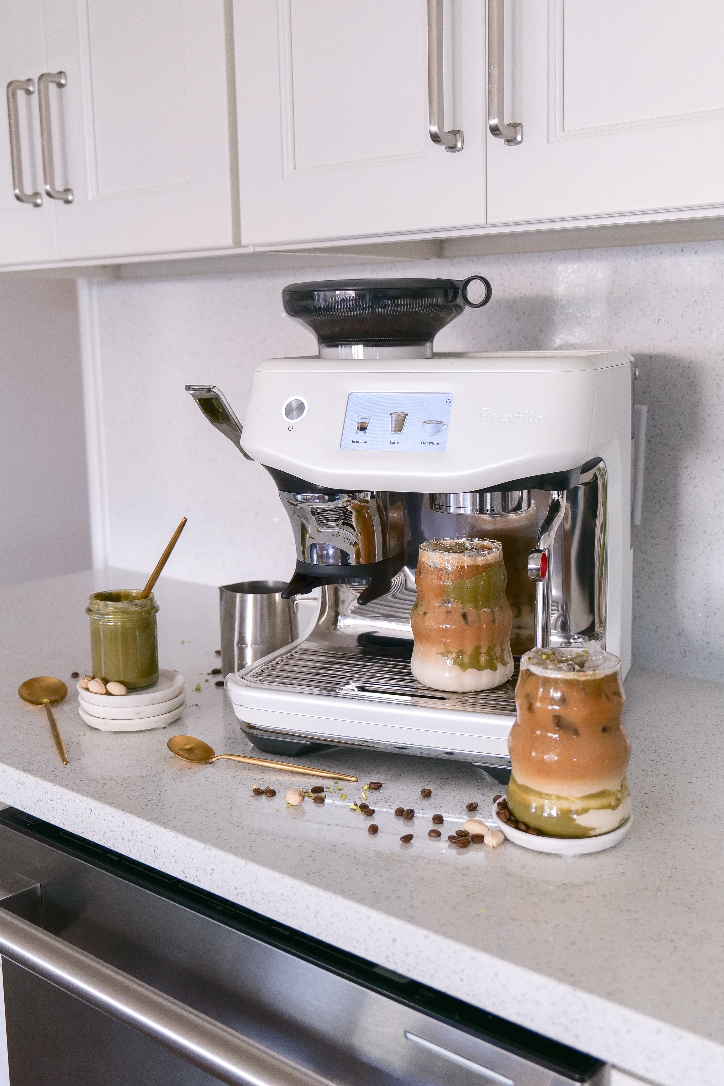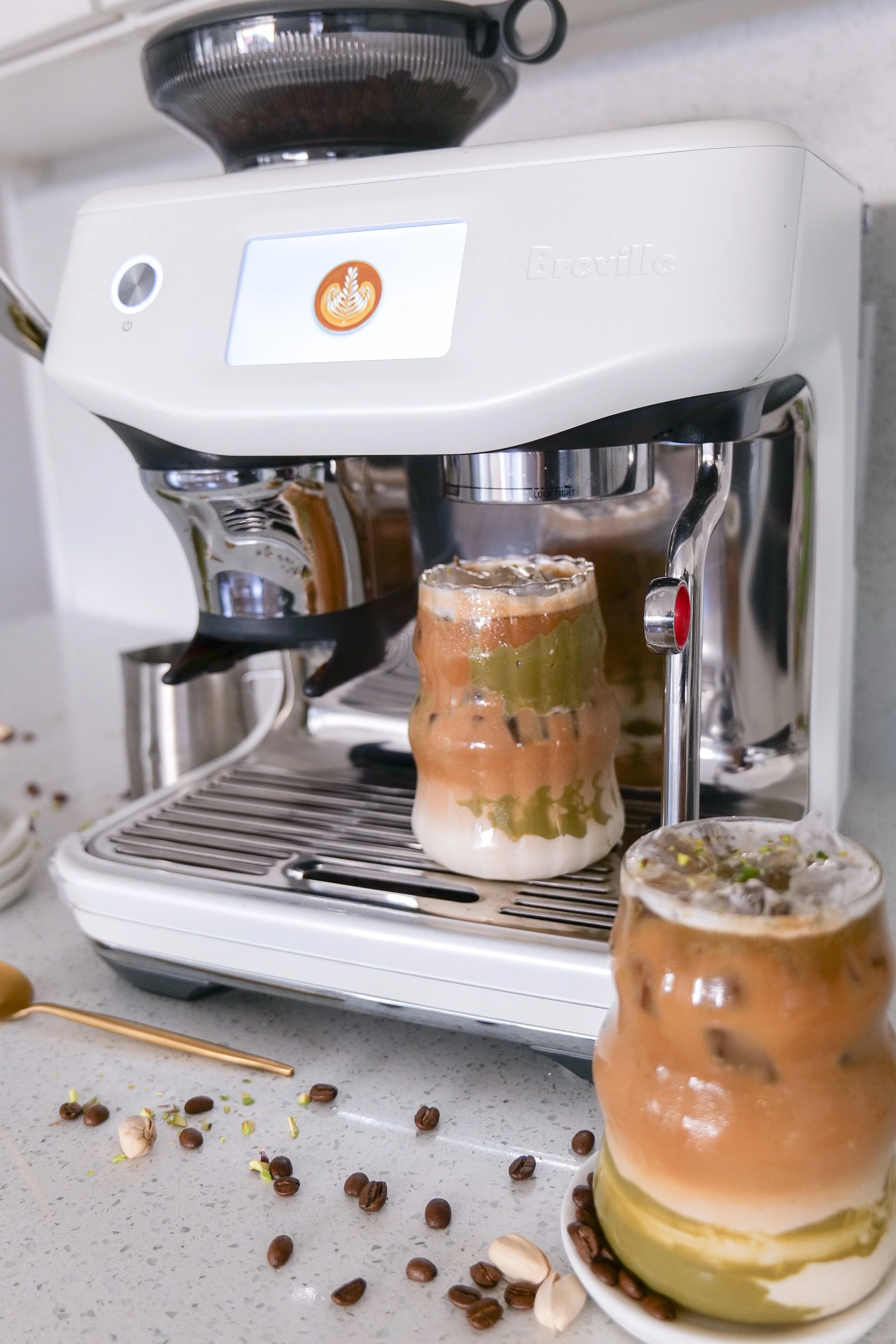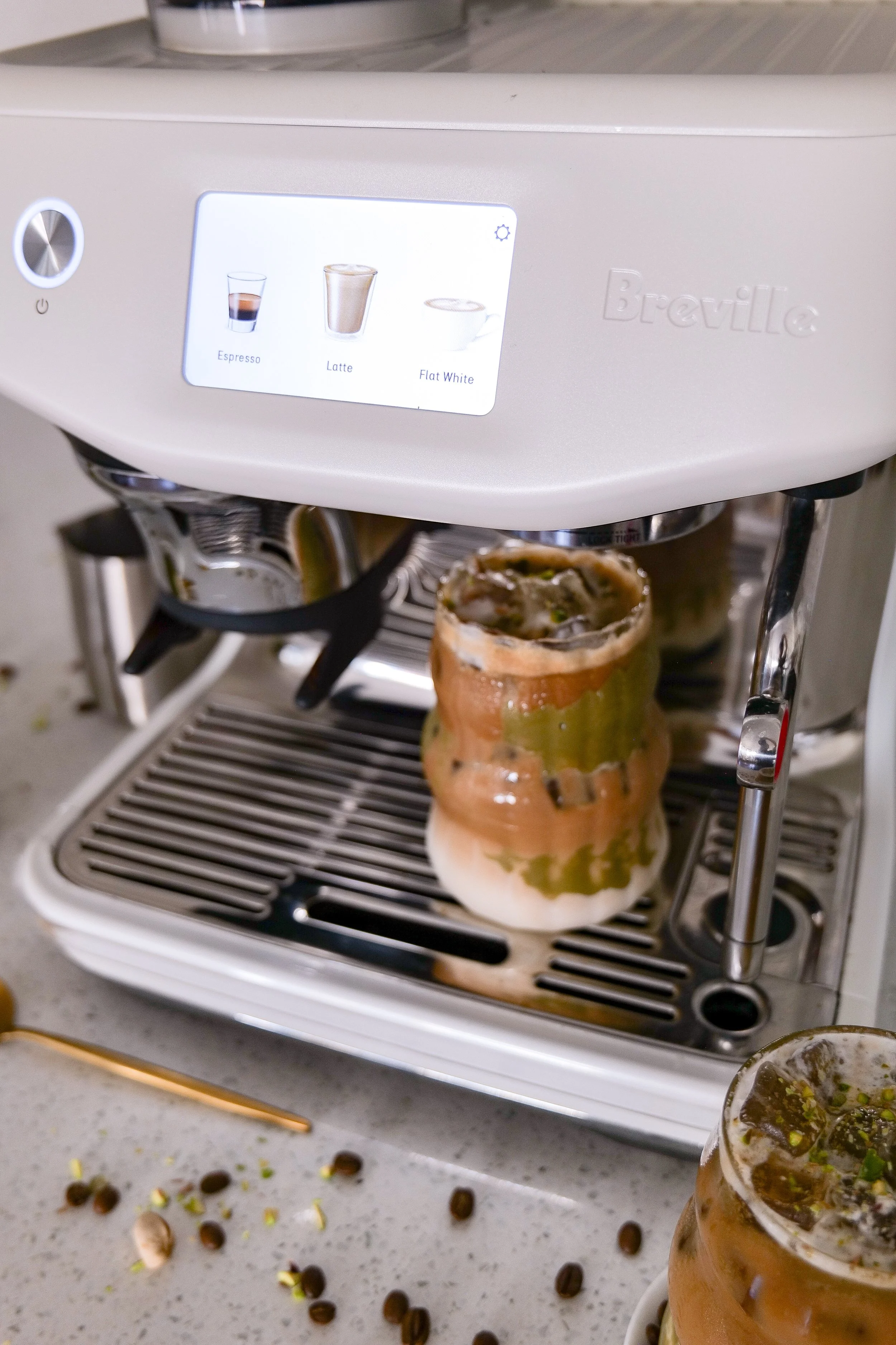 To create a mesmerizing Iced Pistachio Latte, gather your essential ingredients of espresso, milk, heavy cream, pistachio syrup, pistachio cream, maple syrup and ice. Start by brewing 2 shots of fresh espresso on top of one teaspoon of pistachio cream. Adjust the cream to suit your desired sweetness, then stir together until it becomes a smooth, velvety texture and the cream has dissolved. Make your sweet cream by adding together the heavy cream, milk, pistachio syrup and maple syrup. I like to make this with my milk frother on the Breville. It heats it up so all the ingredients mix together better, so with it you'll need to place in fridge or freezer after to cool down. You can also use a hand frother. Pour the delightful blend of sweet cream over ice, followed by your shots of espresso. You can make this in a tall glass for a professional look, along with some pistachio cream on the inside of class for added color. For extra flair, garnish your sweet drink with crushed pistachios. These visuals not only enhance the experience but also bring your homemade creation to life. Enjoy watching me create this drink with this video from my Instagram & TikTok.