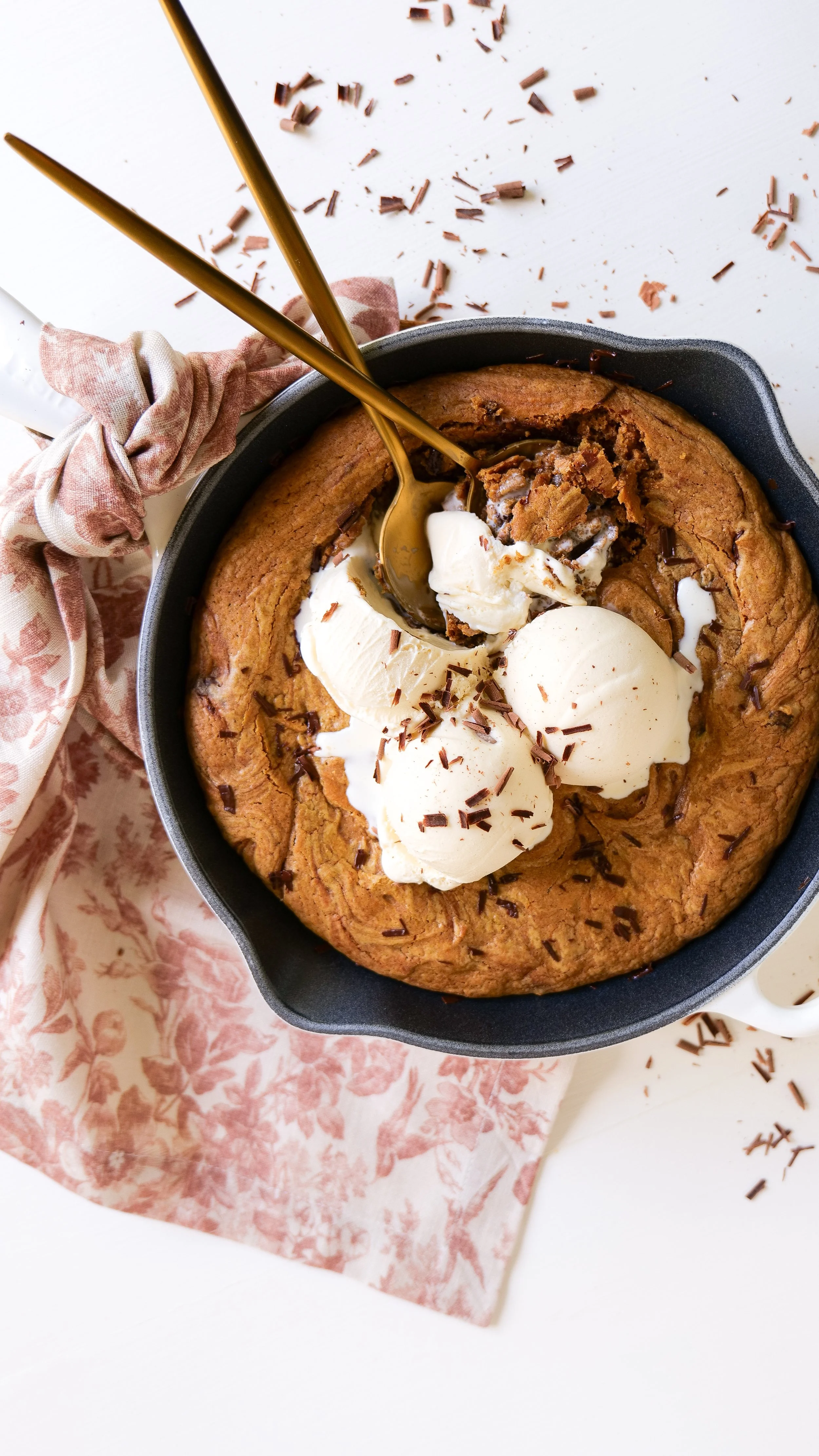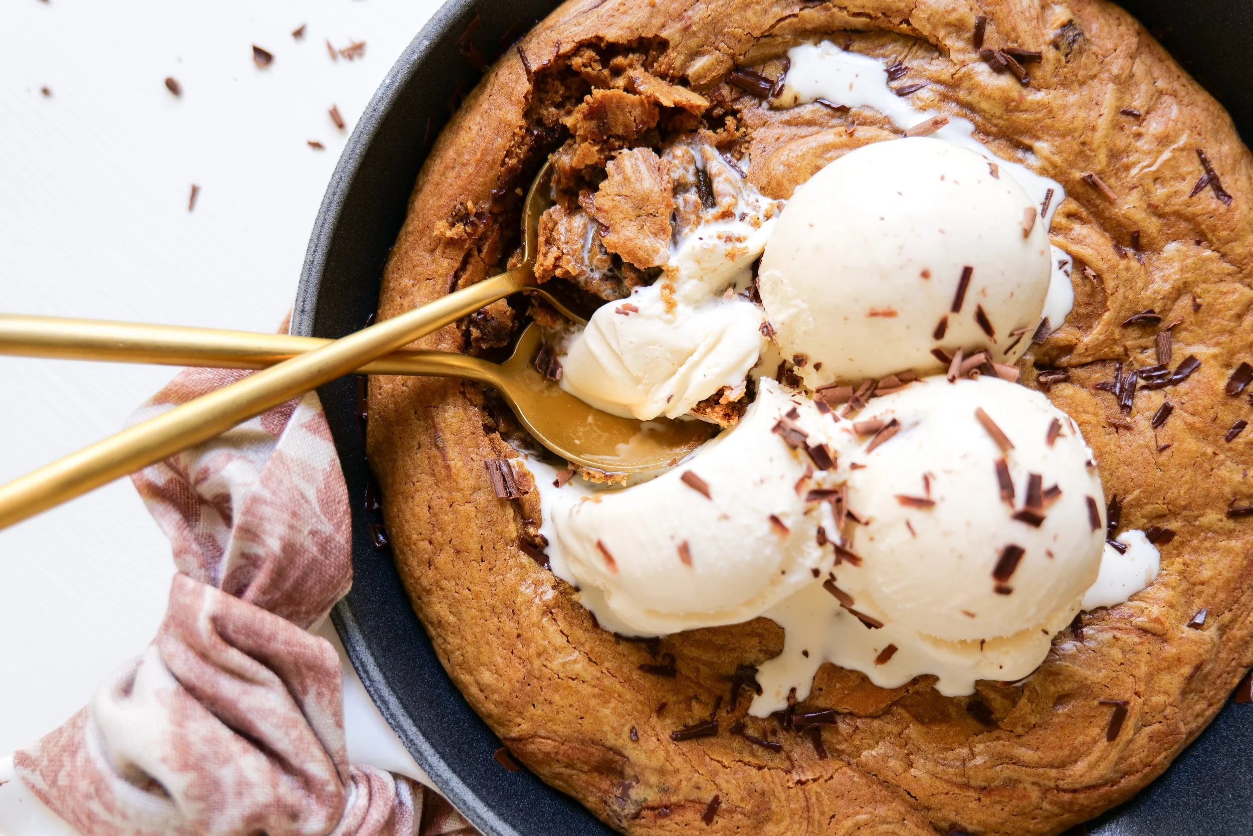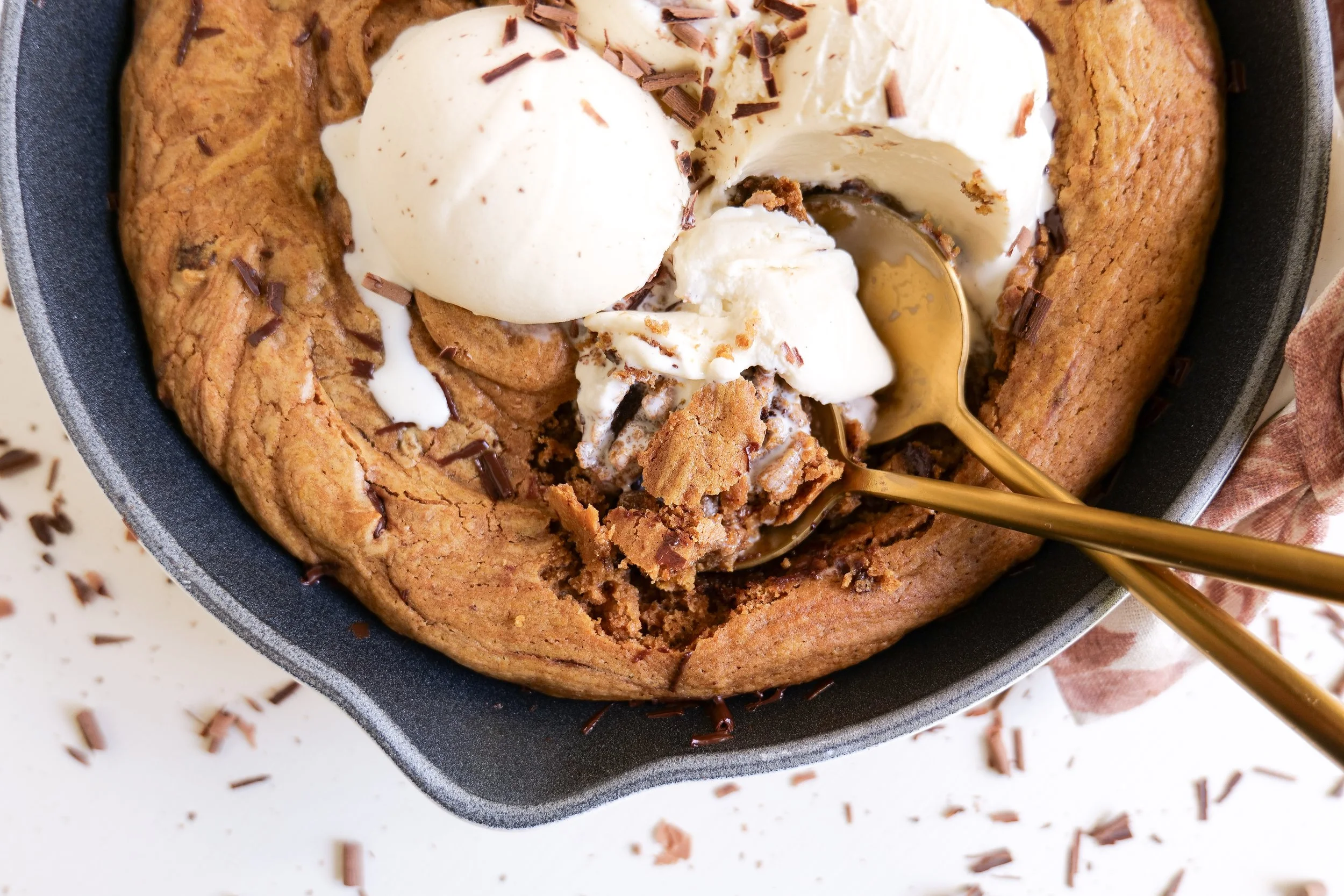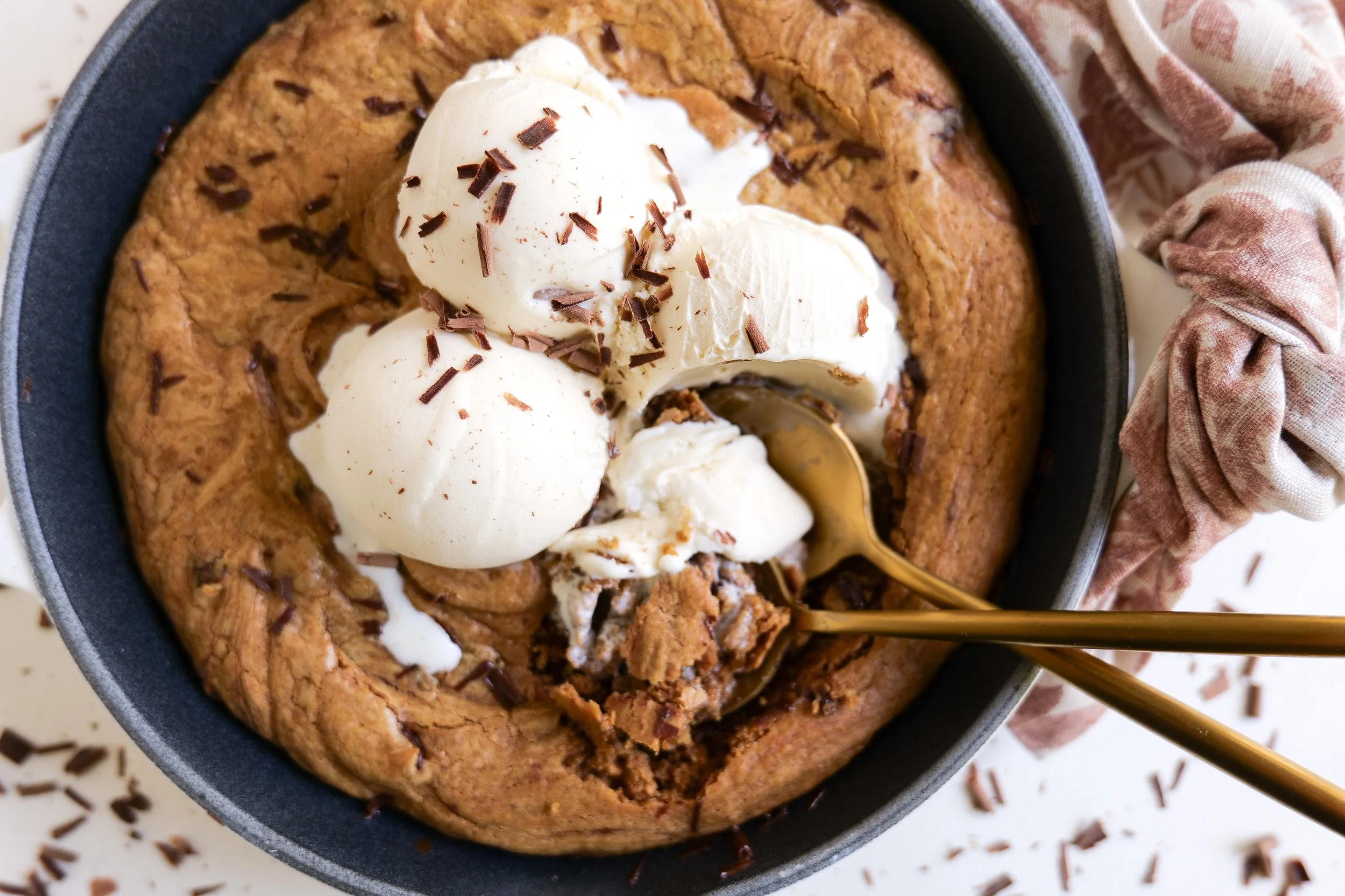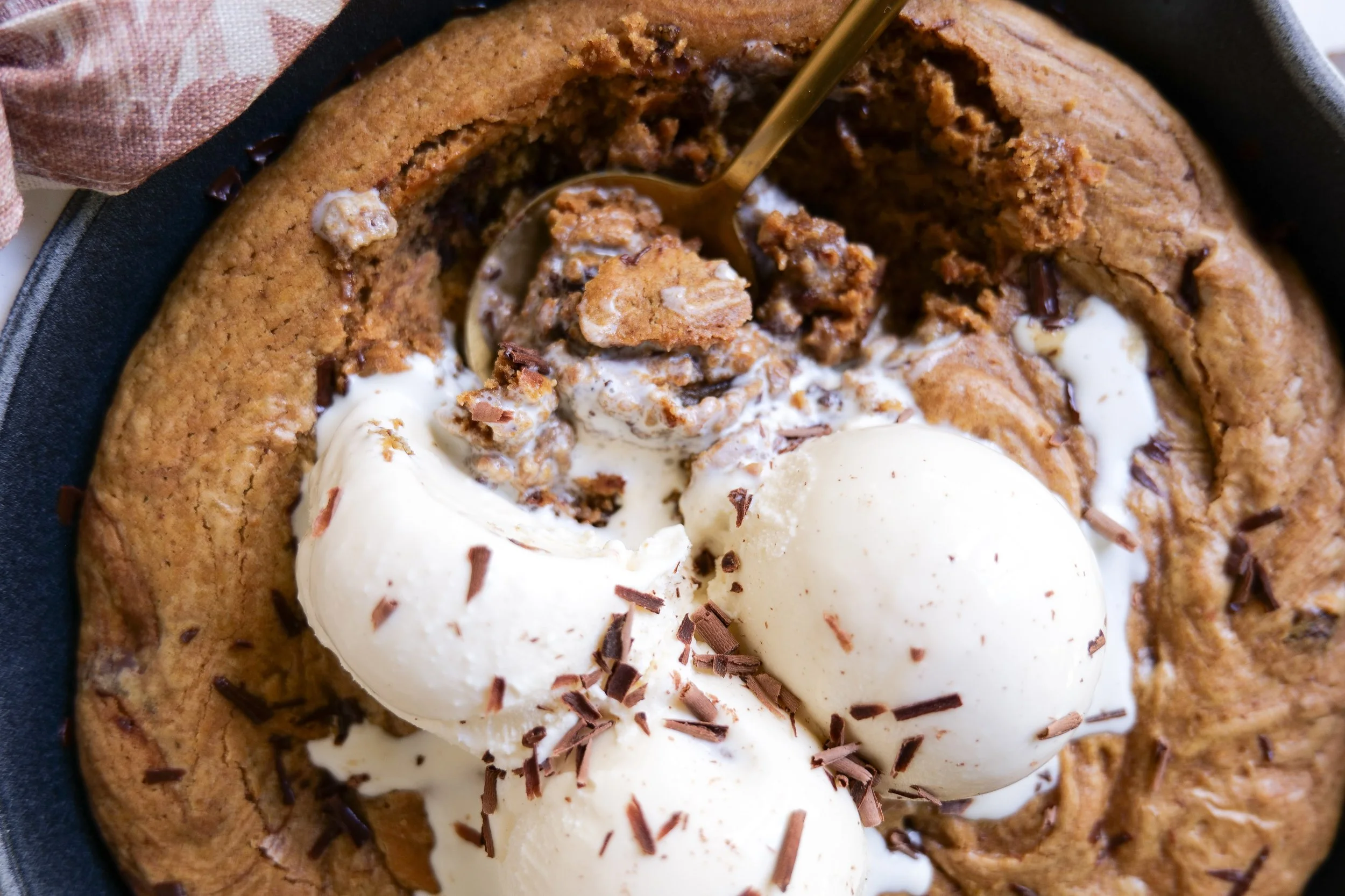 7. Fold cookie dough into a skillet and press in to fill every inch and pack down. Add skillet to preheated oven and bake for 20 minutes or until crispy on the edges and cooked but gooey on the center. Serve with vanilla ice cream on top and enjoy!