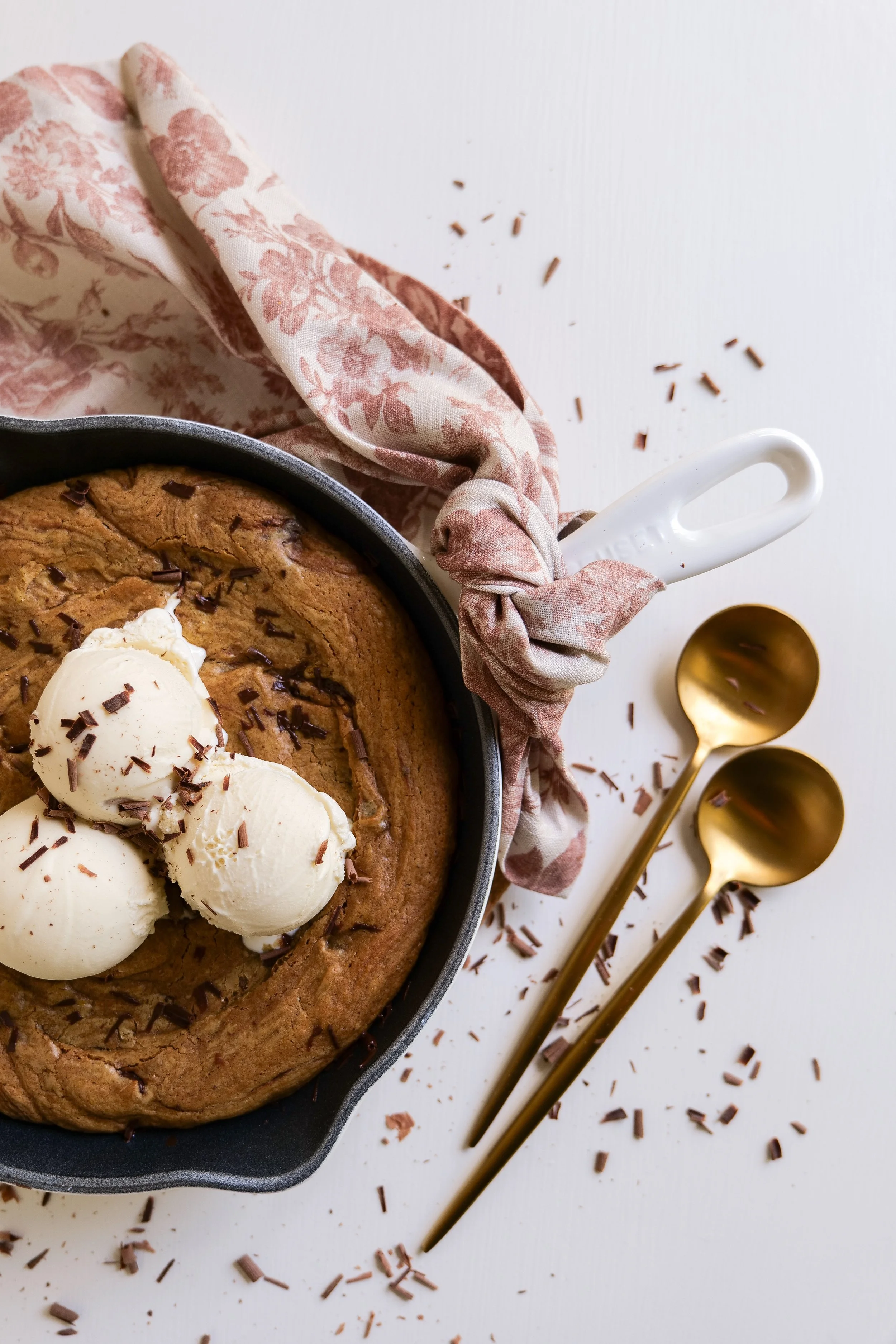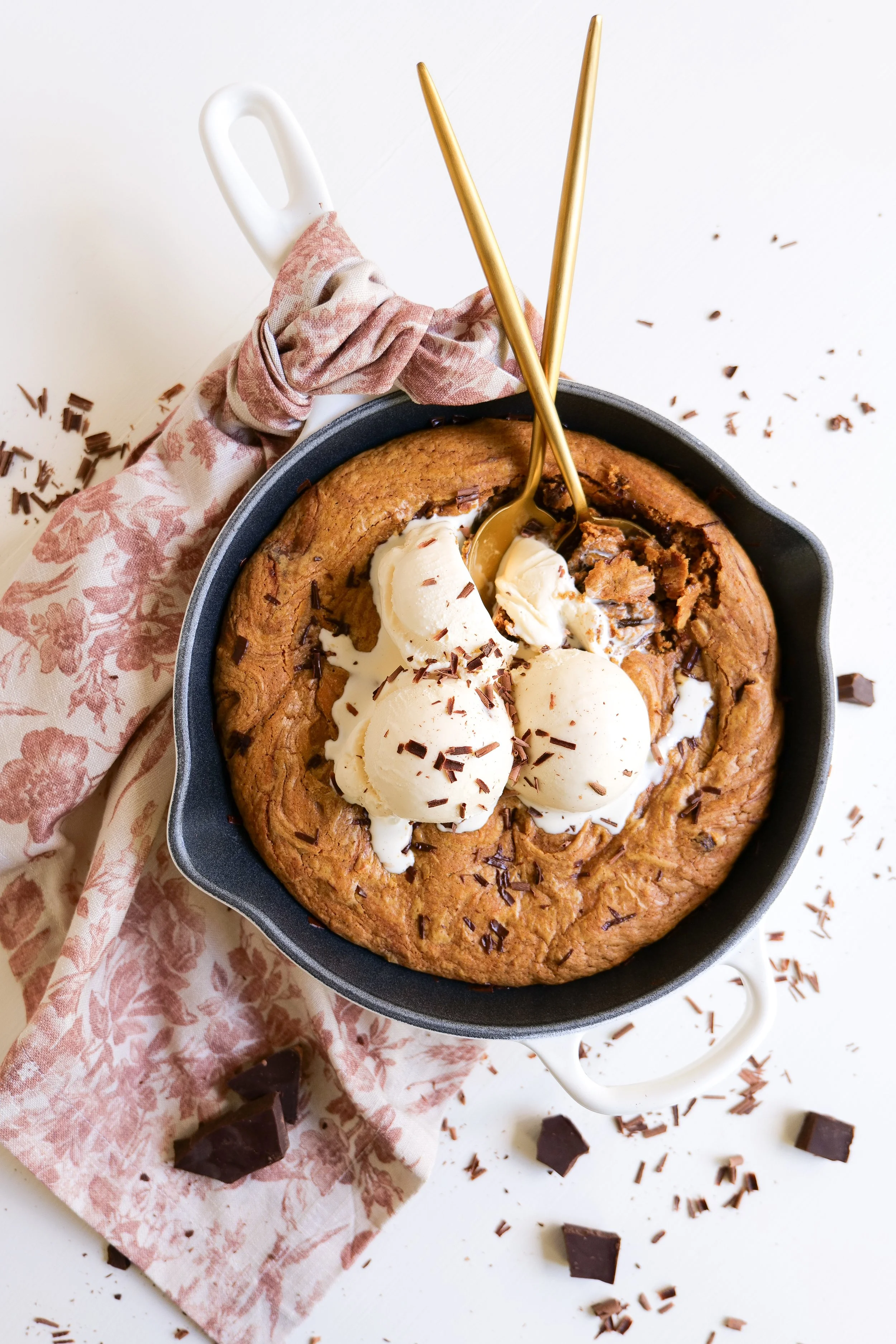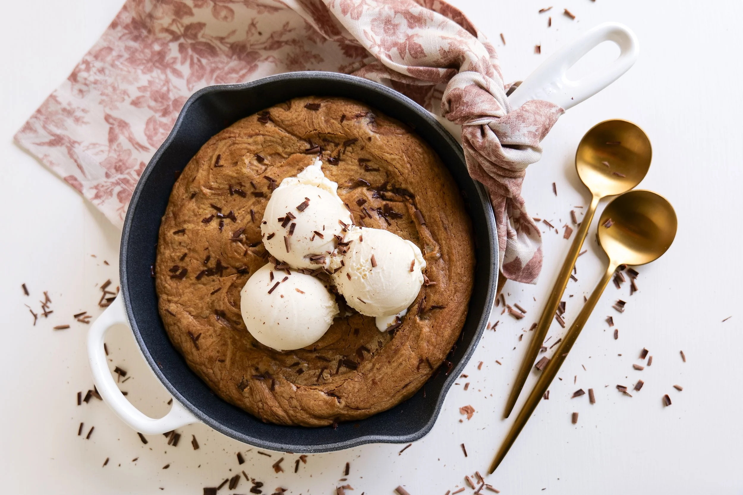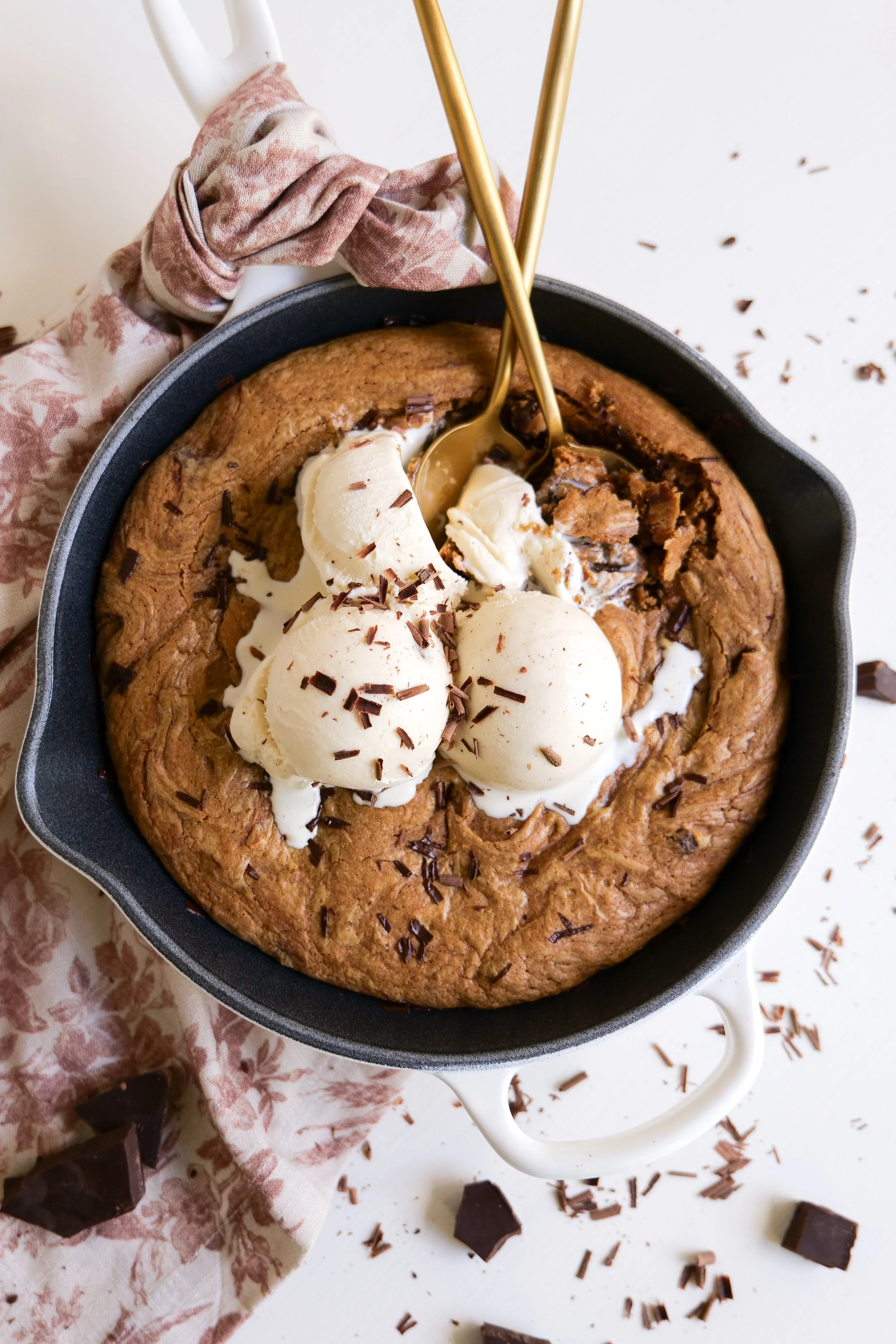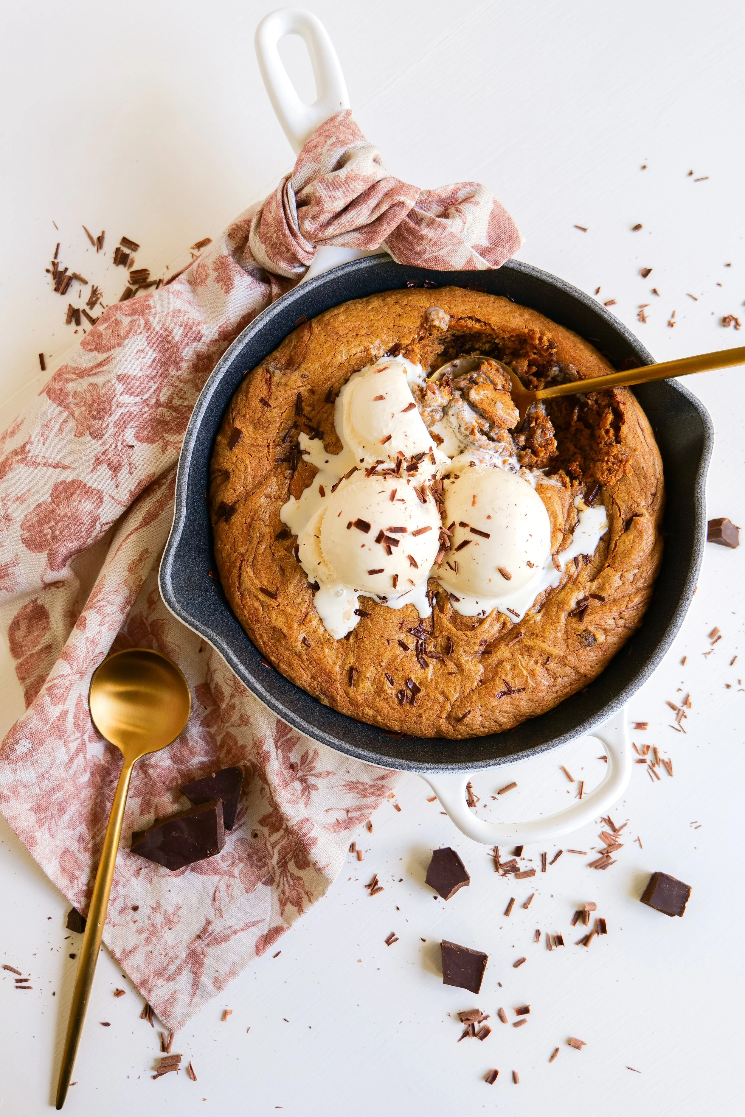 7. Fold cookie dough into a skillet and press in to fill every inch and pack down. Add skillet to preheated oven and bake for 20 minutes or until crispy on the edges and cooked but gooey on the center. Serve with vanilla ice cream on top and enjoy!