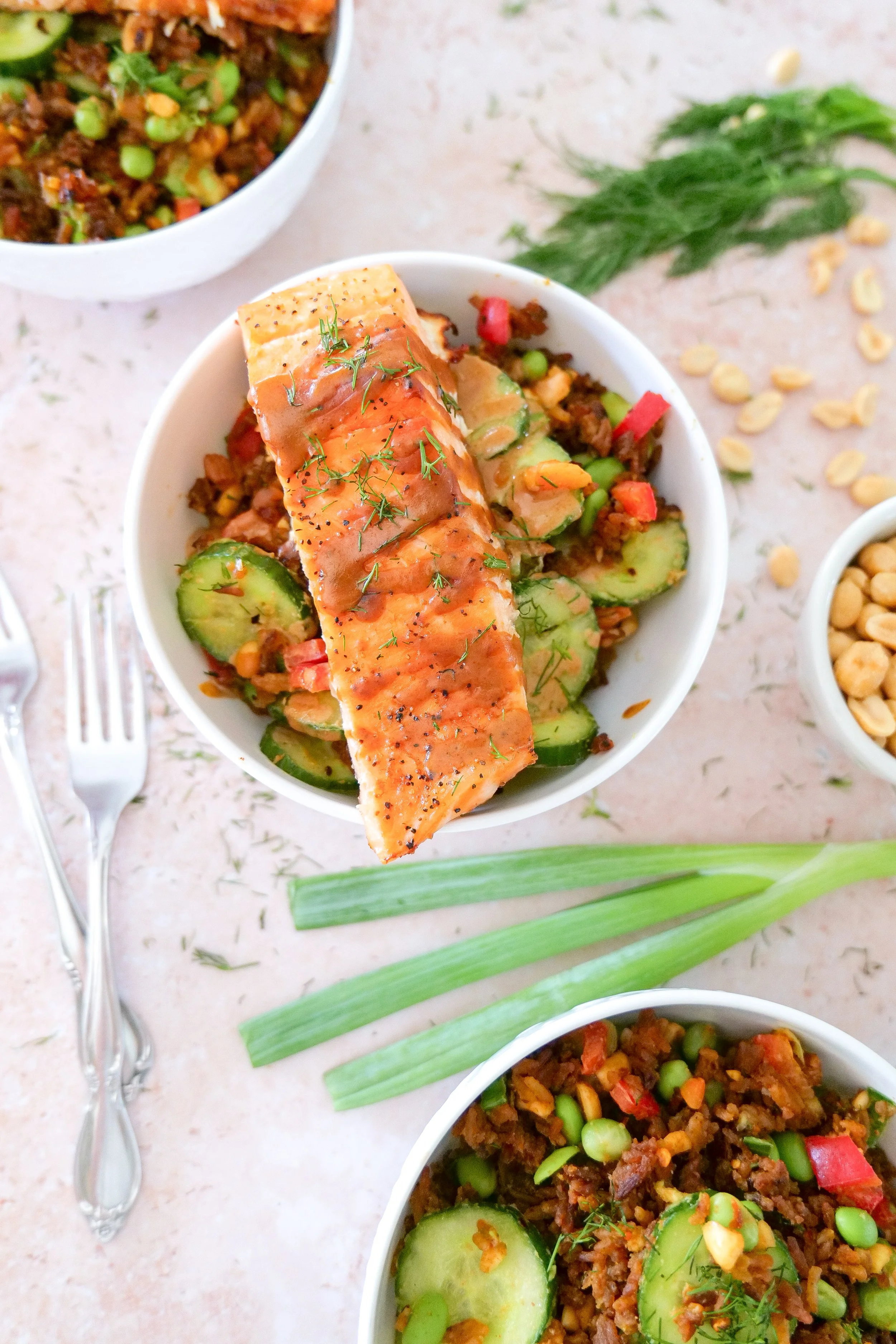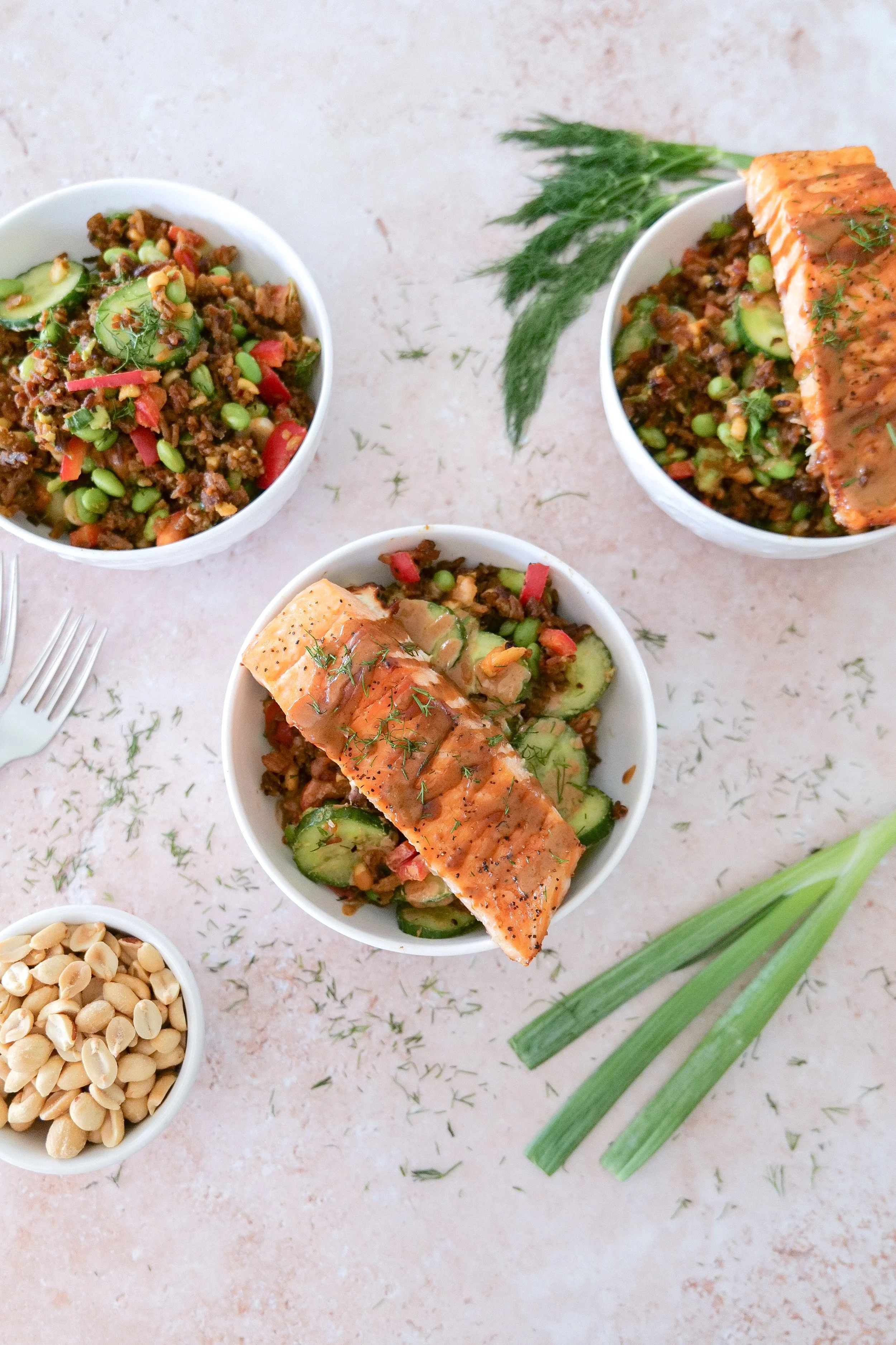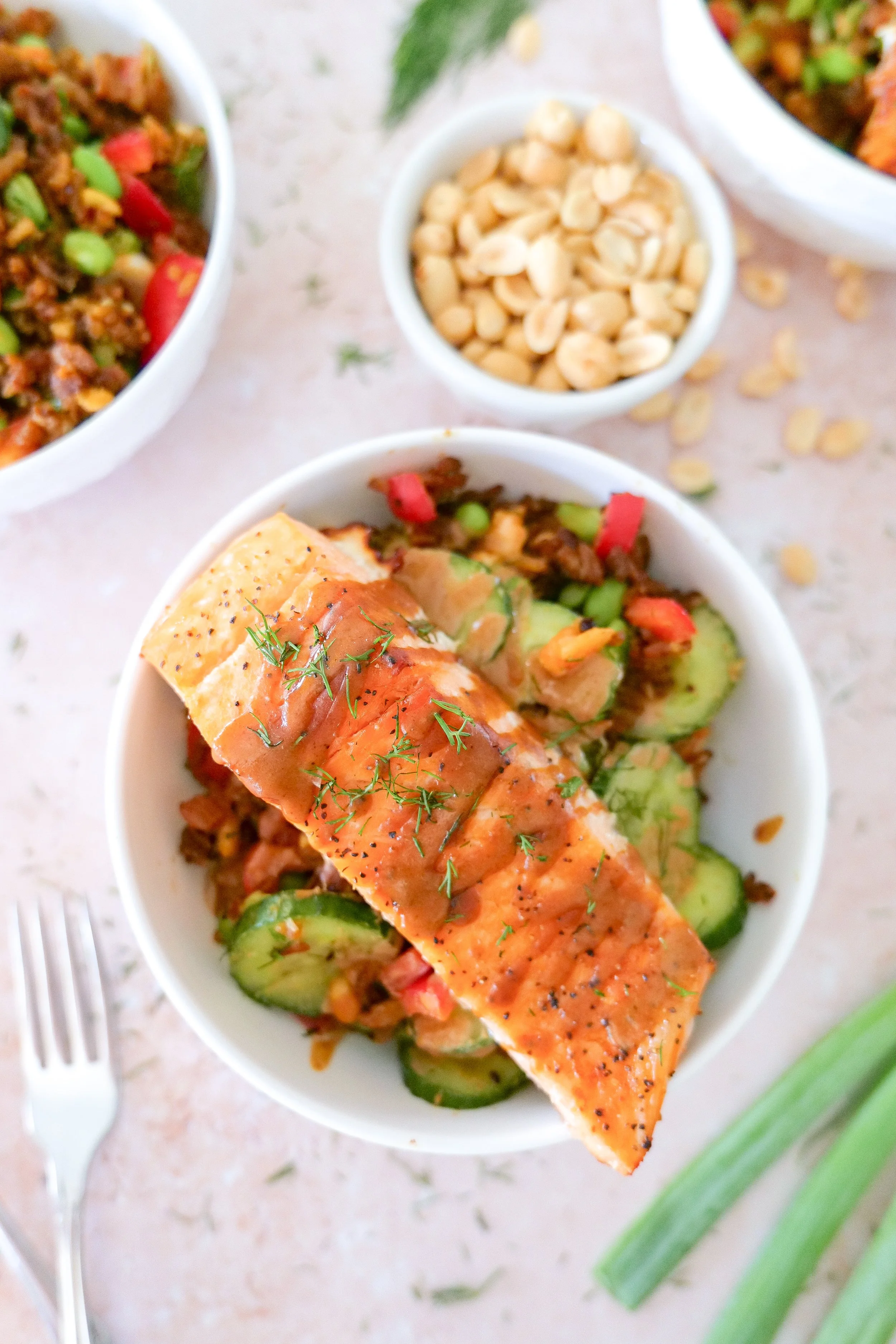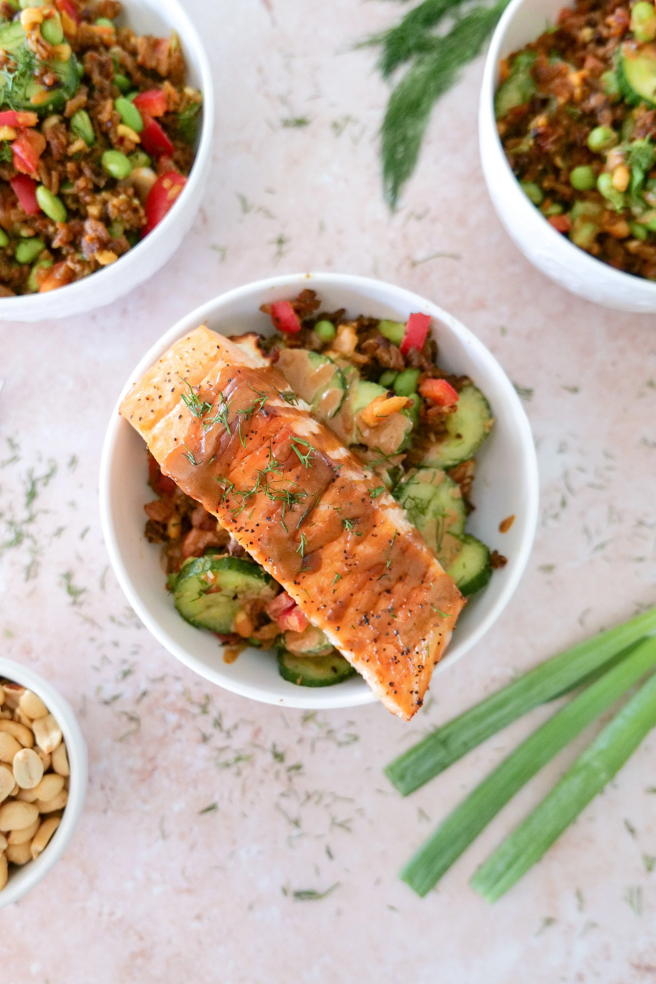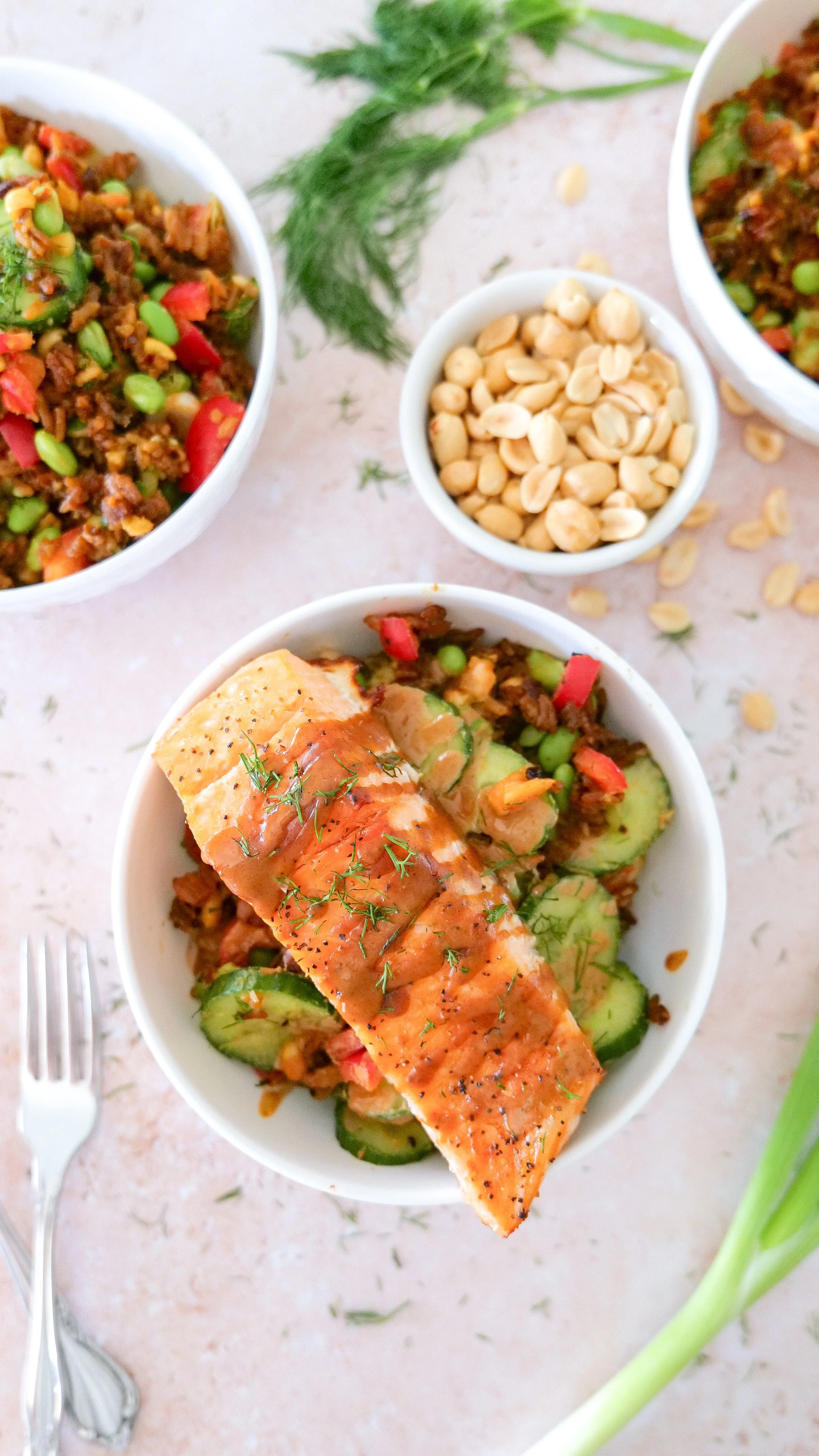 3. In a large bowl combine edamame, avocado, cucumber, red bell pepper, spring onions, and dill. Once rice is cooked add in rice and pour dressing over top (leaving some to top salmon with) Sprinkle crushed peanuts on top and serve with fresh baked salmon and additional drizzle of peanut sauce. Enjoy!